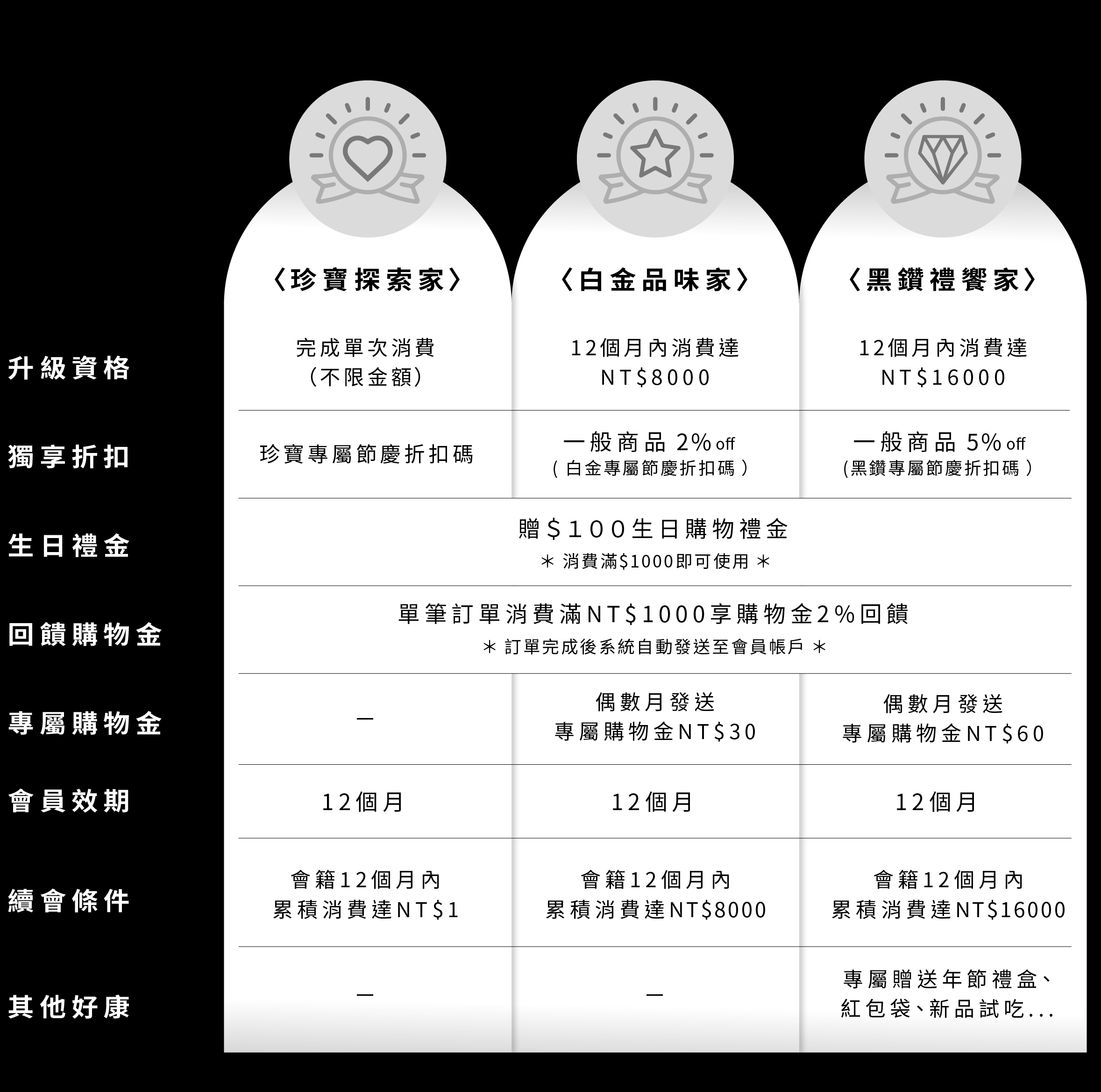 1. 註冊即成為一般會員,會員消費金額達標升等資格,一律為次日升等。